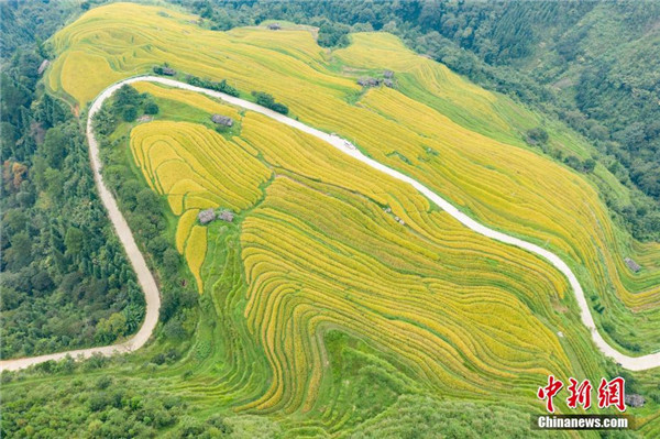 金秋時節(jié),貴州省榕江縣計劃鄉(xiāng)陽開梯田水稻進(jìn)入成熟期,金黃色的梯田構(gòu)成了一幅美麗的秋天圖景。