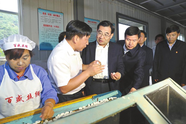 鎮(zhèn)安縣是深度貧困縣,自然條件差,貧困人口多,脫貧難度大。胡和平首先來到永樂街道辦事處中合村永田農(nóng)業(yè)發(fā)展公司,實地調(diào)研食用菌產(chǎn)供銷一體化脫貧項目,詳細(xì)了解產(chǎn)品生產(chǎn)工藝和銷售情況,鼓勵企業(yè)擴大生產(chǎn)規(guī)模,提升品牌價值,做大海外市場,在提高效益的同時增強帶動群眾增收能力。在百盛繅絲廠,胡和平聽取公司生產(chǎn)經(jīng)營和脫貧幫扶情況介紹,了解選繭、煮繭、繅絲、復(fù)整等生產(chǎn)流程,并與前來出售蠶繭的農(nóng)民張秀成交談。當(dāng)聽說張秀成今年養(yǎng)繭收入6000多元,胡和平十分高興。他希望企業(yè)依托商洛青山綠水,發(fā)展綠色產(chǎn)業(yè),延長產(chǎn)業(yè)鏈條,帶動更多群眾擺脫貧困。