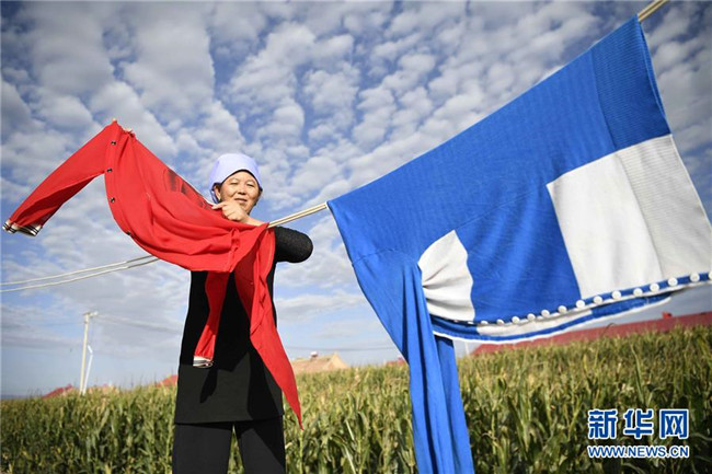 在中寧縣喊叫水鄉(xiāng)賀家口子村,村民金風(fēng)花在晾曬衣服(9月6日攝)。新華社記者 王鵬 攝