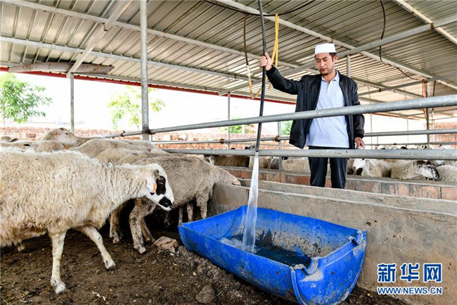 在中寧縣喊叫水鄉(xiāng)賀家口子村,養(yǎng)殖戶(hù)賀學(xué)銀在給羊喂水(9月6日攝)。新華社記者 郭緒雷 攝