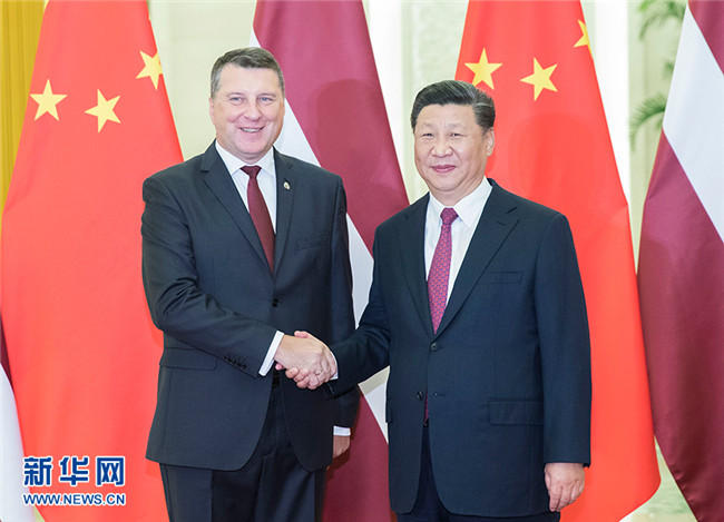 國家主席習近平18日在人民大會堂會見來華出席夏季達沃斯論壇的拉脫維亞總統(tǒng)韋約尼斯。