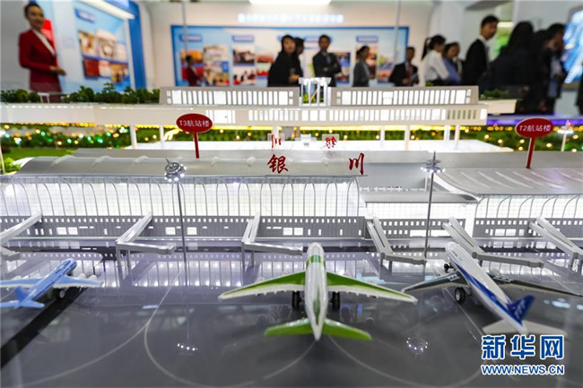 9月19日,觀眾在參觀展覽上展出的銀川河?xùn)|國際機(jī)場綜合交通樞紐模型。9月19日,寧夏回族自治區(qū)成立60周年大型成就展在銀川國際會(huì)展中心開幕。記者沈伯韓攝
