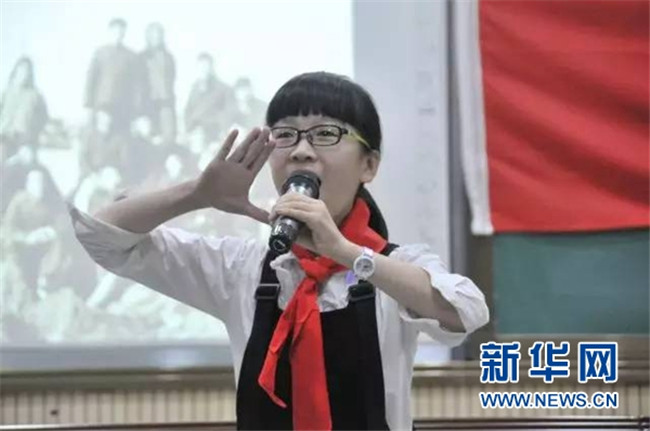 2016年5月31日晚,椒江區(qū)一名小學生在有關學習墾荒精神的主題班會上發(fā)言。新華社記者 王俊祿 攝