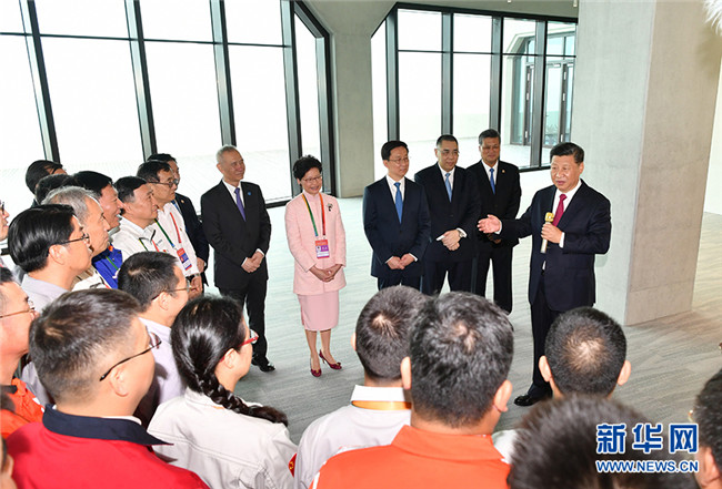東人工島位于港珠澳大橋水上橋梁和水下隧道的銜接部分,是大橋建設(shè)中的關(guān)鍵節(jié)點工程。習(xí)近平等乘車來到這里,登上西側(cè)平臺眺望大橋,結(jié)合圖片、模型詳細了解大橋建設(shè)情況,并會見了大橋管理和施工等方面的代表,同他們一一握手、親切交談。他指出,港珠澳大橋是國家工程、國之重器。你們參與了大橋的設(shè)計、建設(shè)、運維,發(fā)揮聰明才智,克服了許多世界級難題,集成了世界上最先進的管理技術(shù)和經(jīng)驗,保質(zhì)保量完成了任務(wù),我為你們的成就感到自豪,希望你們重整行裝再出發(fā),繼續(xù)攀登新的高峰。