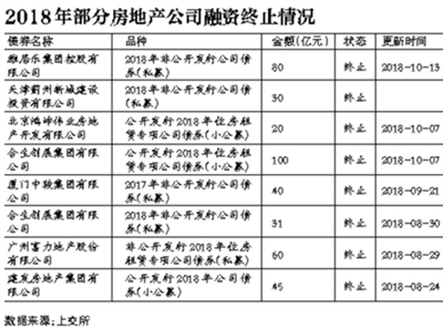 2018年10月份以來,已經(jīng)有多起涉房融資計劃中止/終止。上交所信息顯示,截至10月25日,已經(jīng)至少有8筆涉房融資計劃中止或終止審查。諸如,雅居樂擬發(fā)行的80億元非公開發(fā)行公司債券“終止”,該筆公司債曾于今年7月“中止”發(fā)行。合生創(chuàng)展100億規(guī)模的租賃住宅專項公司債券、天津薊州新城建設(shè)投資有限公司30億元的非公開發(fā)行公司債券、北京鴻坤偉業(yè)房地產(chǎn)開發(fā)有限公司20億元的住房租賃專項公司債券“終止”審查。10月份顯示“中止”融資計劃的有:中山招商-時代地產(chǎn)購房尾款資產(chǎn)支持專項計劃,擬發(fā)行金額14.3億元;奧園集團(tuán)有限公司非公開發(fā)行2018年住房租賃專項公司債,擬發(fā)行金額10億元,等等。