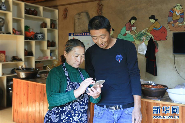 夏永春與妻子用手機(jī)查看訂單(10月10日攝)。貧困戶(hù)夏永春兩口子靠著地道鄉(xiāng)土手藝,在山東蘭陵縣金嶺鎮(zhèn)壓油溝風(fēng)景區(qū)里開(kāi)了一家農(nóng)家特色咸菜坊,年收入一下躥升到七八萬(wàn)元。新華社記者 王南 攝