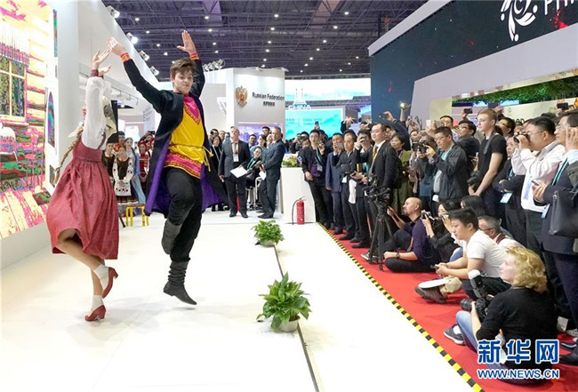 11月6日,俄羅斯演員在首屆中國國際進(jìn)口博覽會俄羅斯展區(qū)表演舞蹈。新華社記者陳建力攝