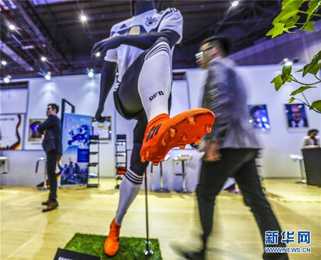 11月6日,參觀者從首屆中國國際進(jìn)口博覽會德國展區(qū)的德國足球國家隊(duì)2018年球衣展品旁走過。新華社記者殷剛攝