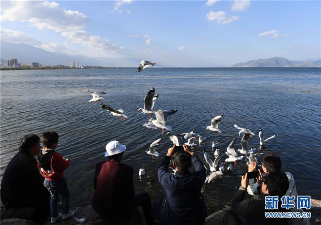 11月8日,游客在大理洱海畔觀賞紅嘴鷗。 初冬時節(jié),云南大理洱海湖水清澈,景色秀麗迷人。 新華社記者楊宗友攝