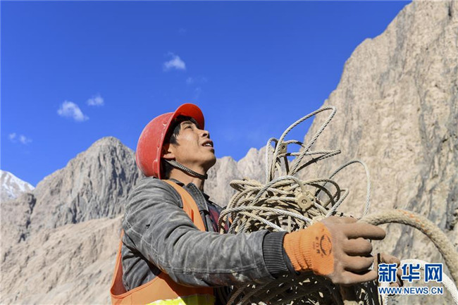 11月12日,在新疆塔什庫(kù)爾干塔吉克自治縣縣城至大同鄉(xiāng)道路的一處施工現(xiàn)場(chǎng),工人劉全在峭壁上作業(yè)。 近日,一支由四川、云南等地工人組成的施工隊(duì)忙碌在帕米爾高原深處的大山中,為塔什庫(kù)爾干塔吉克自治縣縣城至大同鄉(xiāng)道路的易落石路段安裝防護(hù)網(wǎng)。崇山峻嶺間,工人要攀爬至峭壁上施工作業(yè),如躍動(dòng)在大山間的“舞者”。據(jù)介紹,這支施工隊(duì)常年活躍在新疆山區(qū)道路的施工現(xiàn)場(chǎng),為風(fēng)險(xiǎn)路段加裝安全防護(hù)裝置,保障過往車輛和沿途村民出行安全。 新華社記者 胡虎虎 攝