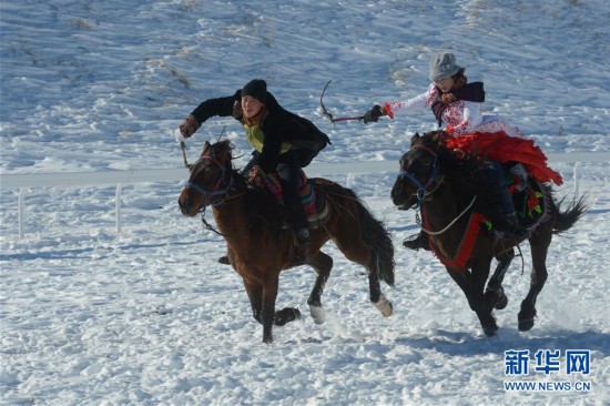 11月17日,當?shù)鼐用裨诒硌輦鹘y(tǒng)民俗“雪地姑娘追”。新華社發(fā)(丁磊 攝)