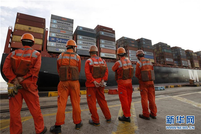 工人列隊走過一艘停泊在洋山深水港碼頭的集裝箱船(2017年9月13日攝)。新華社記者方喆攝