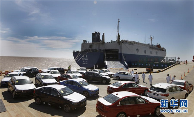 在位于上海臨港新城的自貿(mào)區(qū)滾裝碼頭上,工作人員將卸下船的車輛開到碼頭指定停車場(2017年9月13日攝)。新華社記者方喆攝