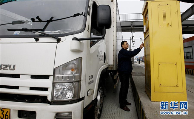 一名卡車司機在上海外高橋的自貿(mào)區(qū)車輛出入口掃描手機二維碼完成通關手續(xù)(2017年1月10日攝)。新華社記者方喆攝