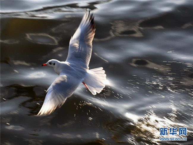11月19日,一只紅嘴鷗從昆明滇池水面上飛越。  新華社記者楊宗友攝
