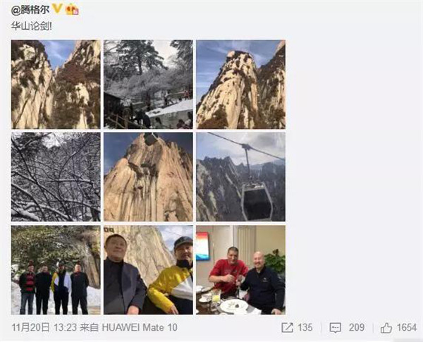 11月20日,騰格爾老師發(fā)布新浪微博稱:“華山論劍!”這當中,有對我們奇險華山美景的肯定與共鳴,更有騰格爾老師給我們“奇險峻秀”的華山帶來的積極的宣傳效果。