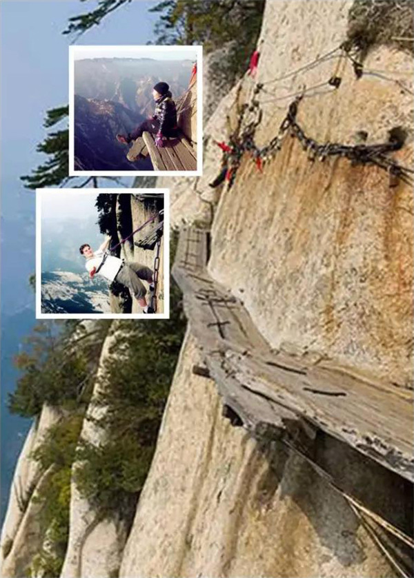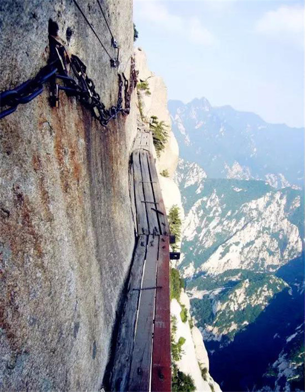 西岳華山歷來被認(rèn)為是五岳之中最為險(xiǎn)峻的,而在華山中,險(xiǎn)中之險(xiǎn)莫過于“長空棧道”和“鷂子翻身”。特別是具有700多年歷史的長空棧道,在華山南峰東側(cè)山腰的萬仞絕壁上鑿出來的幾個(gè)踏腳之處,鑲嵌石釘搭木椽搭建了一個(gè)百余米懸空的棧道,讓人望而卻步,如果你有恐高癥,僅僅看一眼都會(huì)讓你驚恐萬分。2013年,著名旅游網(wǎng)站“Smarter Travel”盤點(diǎn)全球最恐怖懸崖步道,將華山長空棧道列為全球十大最恐怖的懸崖步道之一。