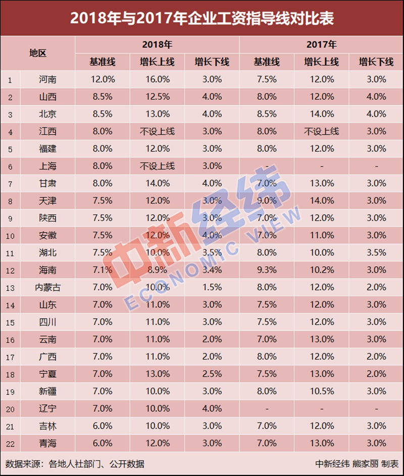 據(jù)中新經(jīng)緯客戶(hù)端(微信公眾號(hào):jwview)不完全統(tǒng)計(jì),截至12月6日,至少已有河南、山西、北京、江西、福建、上海等22個(gè)省份公布了2018年企業(yè)工資指導(dǎo)線(xiàn)。