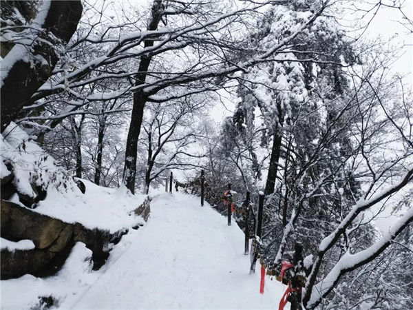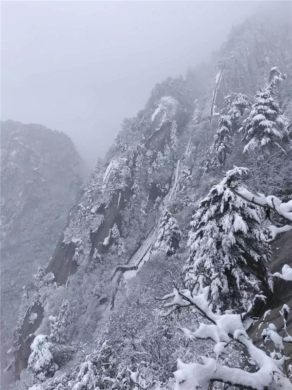到了北峰和蒼龍嶺,這才是真正的華山,天氣不好,但是一樣很美。到處銀裝素裹,走在蒼龍嶺,這里有“韓愈投書”的故事,左手懸崖,右手深淵,就像這天地間孤獨的俠客,頭頂上傳來雷音陣陣,難道有修道高人在渡雷劫,準備羽化成仙?