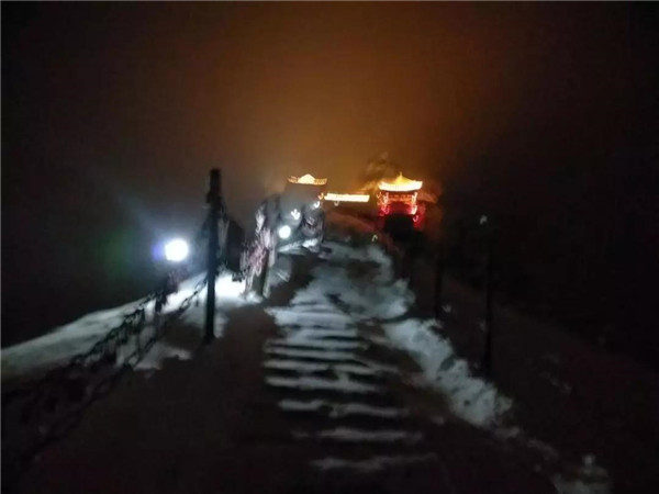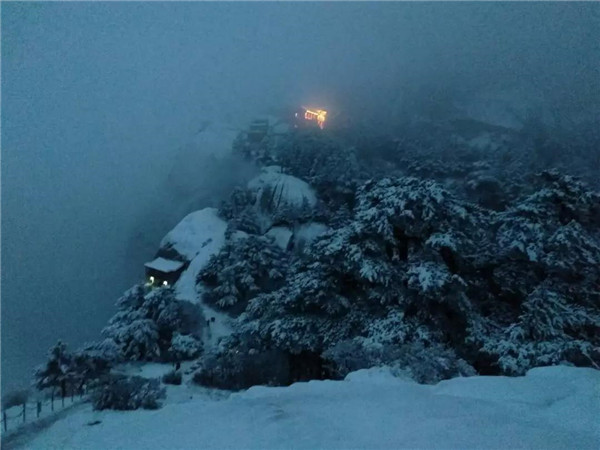 一直往上走,天色漸漸暗下來。和路上遇到的兩位山友告別后,我一個人繼續(xù)走,路面都是積雪,有的還結冰了,只好綁上冰爪,打開手電,偶爾抬頭看看被白雪浸染的山林。忽然,前面山頂上一片燈火輝煌,不知道那是不是天上的宮闕?
