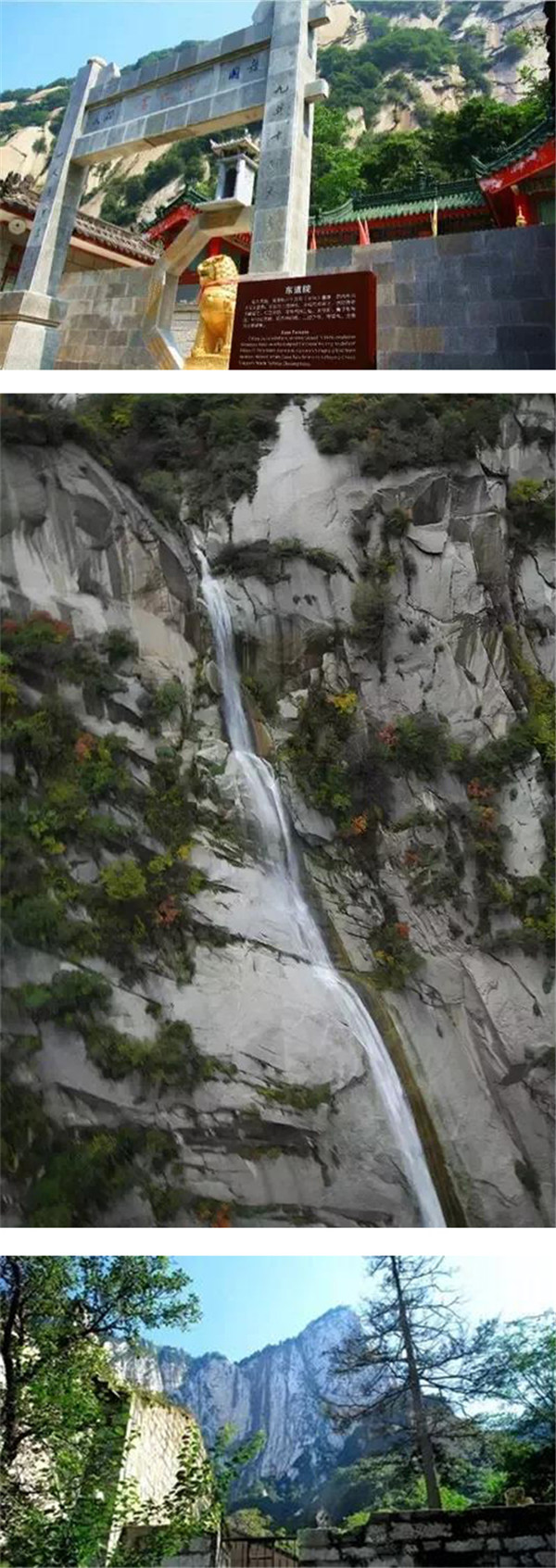 青柯坪背依主峰,絕壁千仞,拔地而起;水簾瀑布,如從云天垂落,跌落谷中,聲如雷霆,主峰由于總是處在逆光和側(cè)逆光中,就象巨靈神剪影緊貼天幕之上。登臨青柯坪,還可眺望秦川,那種感覺就如從洞天俯視塵寰。四周峰巒環(huán)繞,林木蔥郁,山寺石洞,掩映其間,這里就是華山風(fēng)水的結(jié)穴處。我們現(xiàn)在所處的是西道院又名紫云宮,這里供奉的是“三霄”娘娘,為道教送子神。明朝時為太華書院,名儒馮從吾坐館任教,著書立說,從學(xué)者三百,可想當(dāng)時的盛況。