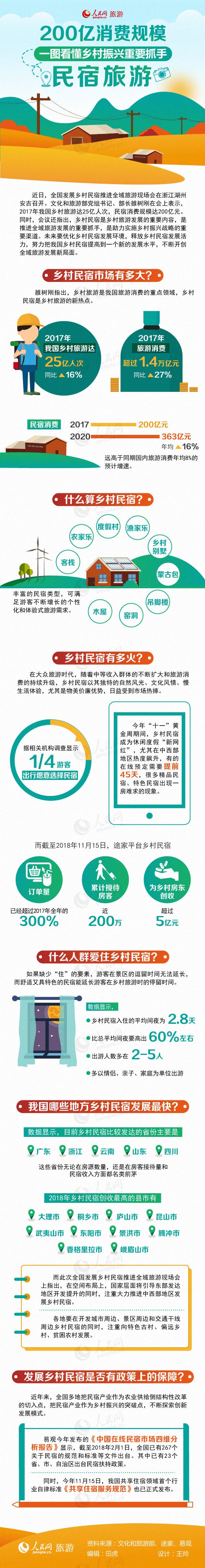 近日,全國發(fā)展鄉(xiāng)村民宿推進全域旅游現(xiàn)場會在浙江湖州安吉召開。文化和旅游部黨組書記、部長雒樹剛在會上表示,2017年我國鄉(xiāng)村旅游達25億人次,民宿消費規(guī)模達200億元。同時,會議還指出,鄉(xiāng)村民宿是鄉(xiāng)村旅游發(fā)展的重要內容,是助力實施鄉(xiāng)村振興戰(zhàn)略的重要渠道,未來要優(yōu)化鄉(xiāng)村民宿發(fā)展環(huán)境,不斷開創(chuàng)全域旅游發(fā)展新局面。如此大的規(guī)模,鄉(xiāng)村民宿到底是什么?哪些地區(qū)鄉(xiāng)村民宿最火?什么人群愿為鄉(xiāng)村民宿買單?一張圖帶你讀懂鄉(xiāng)村民宿?。ㄌ锘ⅲ?/p>