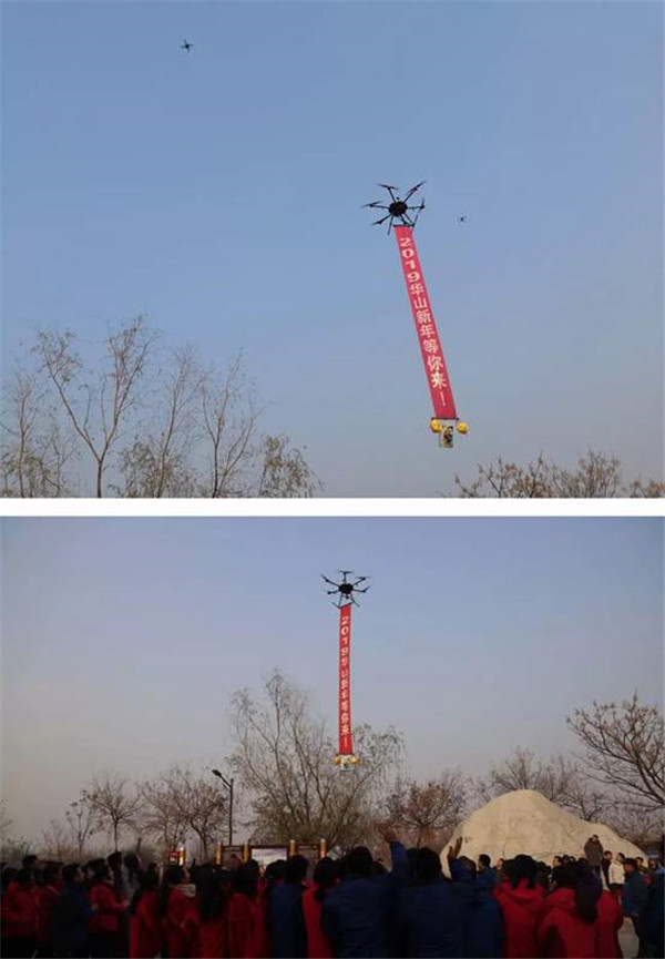 啟動(dòng)儀式上,華山景區(qū)還為活動(dòng)前期征集的十名幸運(yùn)游客送上新年大禮包,讓跨年登山的游客享受到華山的新年祝福。同時(shí),為了配合活動(dòng)效果,讓華山新年更具新意,現(xiàn)場出動(dòng)三架無人機(jī)進(jìn)行空中表演,更是以語音播報(bào)及橫幅展示的方式為現(xiàn)場游客送上新年寄語。