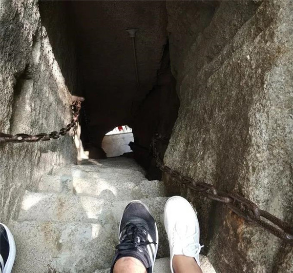 古書記載:在華山大上方有一天然石洞,形似豎井,壁如刀削,僅容一人上下。洞邊有一木梯,石壁上刻有“洞在高山”四個(gè)大字。出洞四望,豁然開朗,峰巒疊翠,林木蒼郁,奇花競(jìng)秀,流泉淙淙,飛鳥時(shí)鳴,給人一種“無限風(fēng)光在險(xiǎn)峰”之感。因?yàn)榇笊戏降缆菲D險(xiǎn),不是游客必經(jīng)之地,但古書記載的景點(diǎn)就在那里。
