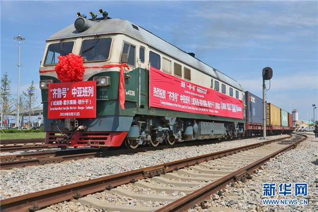 滿載貨物的“齊魯號”中亞班列從山東威海港出發(fā),駛往烏茲別克斯坦首都塔什干(2018年8月31日攝)。新華社發(fā)(唐克 攝)