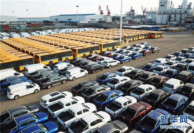 大批國產(chǎn)車輛在江蘇連云港港口碼頭等待裝船(2018年12月31日無人機拍攝)。新華社發(fā)(耿玉和 攝)