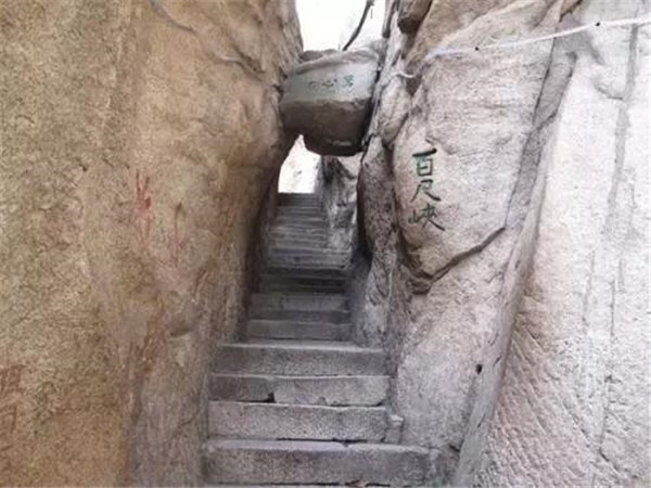 “千尺幢”在華山峪古道“回心石”上,是經(jīng)華山峪登主峰的必經(jīng)之道。這里原為一崖間裂隙,直立70度,后來人們沿隙鑿?fù)爻陕罚惺A370級(jí),階寬僅容半足,游人登臨時(shí),仰視一線天,俯視若臨深井。