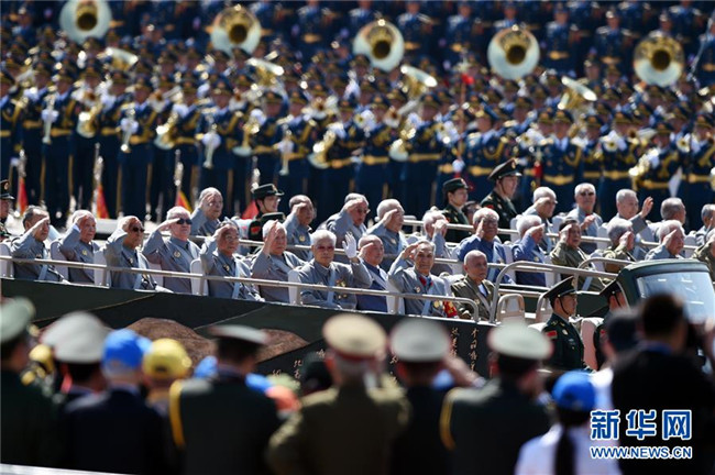 2015年9月3日,中國人民抗日戰(zhàn)爭暨世界反法西斯戰(zhàn)爭勝利70周年紀念大會在北京隆重舉行。這是抗戰(zhàn)老兵乘車方隊通過天安門廣場。 新華社記者王定昶攝