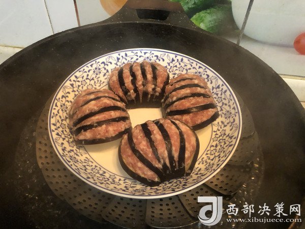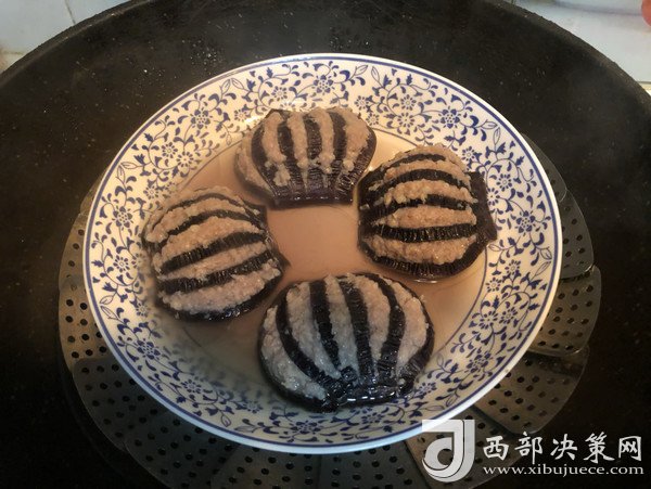 5鍋中煮沸水,放入裝茄子的盤子,蓋上鍋蓋大火蒸15分鐘