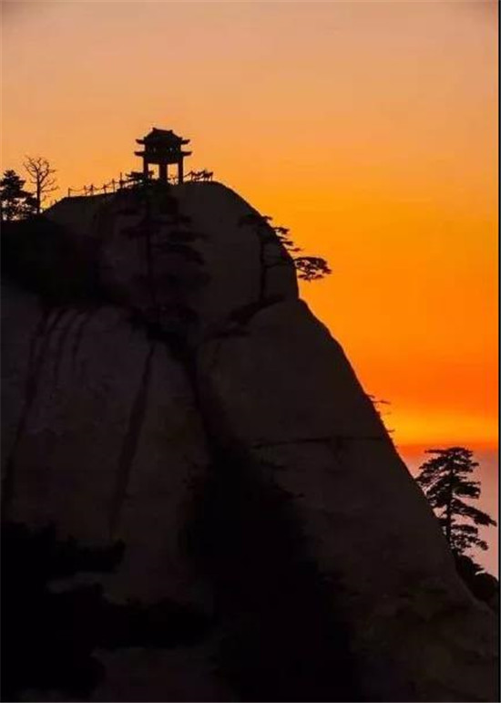 此時(shí),但見(jiàn)夜幕自東方悄然隱退,晨曦初露,漸漸霞光瑰麗,云源奔涌。瞬間,一輪火球噴薄而出,繼而光芒四射,氣象萬(wàn)千,整個(gè)世界大放光明,游人身心為之一振。待云霧散盡,蒼松翠柏,則更加清麗悅目,美妙神奇。故而,游名山者必登華山,登華山者必觀日。