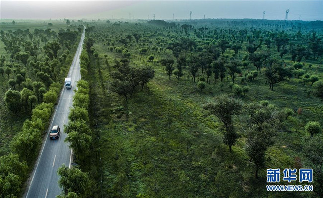 汽車行駛在陜西省榆林市靖邊縣東坑鎮(zhèn)新建村的道路上(2018年8月1日無人機(jī)拍攝)。陜西省開展的天然林保護(hù)工程和全面治理荒沙行動,極大改善了毛烏素的生態(tài)環(huán)境,也使沙漠南緣的陜西省榆林市實現(xiàn)從“沙進(jìn)人退”到“綠進(jìn)沙退”的轉(zhuǎn)變。 新華社記者 陶明 攝