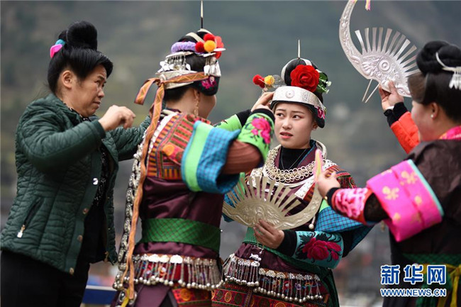 3月16日,在丹寨縣南皋鄉(xiāng)清江村,苗族姑娘為翻鼓節(jié)悉心打扮。 當(dāng)日,貴州省黔東南苗族侗族自治州丹寨縣南皋鄉(xiāng)清江村清江村舉行翻鼓節(jié)。翻鼓節(jié)是當(dāng)?shù)孛缱宕迕裼哟焊絹淼拿袼坠?jié)日,至今已有近600年歷史,每年農(nóng)歷二月舉行。 新華社記者 楊文斌 攝