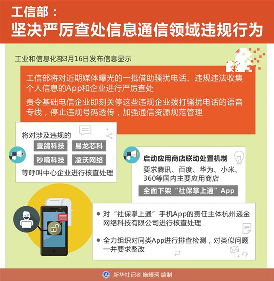 據(jù)了解,工信部將對(duì)涉及違規(guī)的壹鴿科技、易龍芯科、秒嘀科技和凌沃網(wǎng)絡(luò)等呼叫中心企業(yè)進(jìn)行核查處理。同時(shí),啟動(dòng)應(yīng)用商店聯(lián)動(dòng)處置機(jī)制,要求騰訊、百度、華為、小米、360等國內(nèi)主要應(yīng)用商店全面下架“社保掌上通”App,對(duì)“社保掌上通”手機(jī)App的責(zé)任主體杭州遞金網(wǎng)絡(luò)科技有限公司進(jìn)行核查處理,并全力組織對(duì)同類App進(jìn)行排查檢測(cè),對(duì)類似問題一并要求整改。