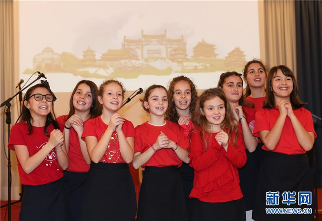 這是2019年2月8日,在意大利拉齊奧的古鎮(zhèn)蒂沃利,蒂沃利國立住讀學(xué)校的學(xué)生們?cè)谥袊汗?jié)慶?;顒?dòng)上給大家拜年。 新華社記者 程婷婷 攝