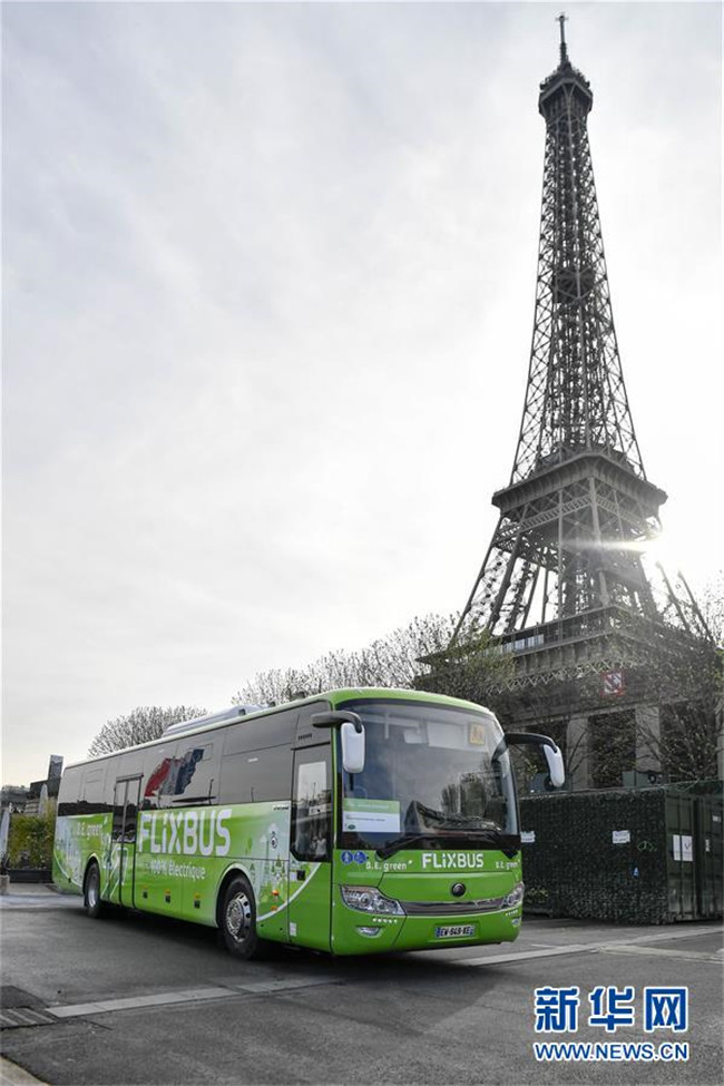 這是2018年4月10日在法國巴黎拍攝的中國宇通電動(dòng)客車。這輛59座電動(dòng)客車在法國巴黎至亞眠的城市間長途客運(yùn)線路上運(yùn)營。 新華社記者 陳益宸 攝