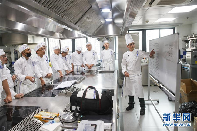 這是2018年10月17日, 來自法國的菲利普(右)在上海藍(lán)帶廚藝職業(yè)技能培訓(xùn)學(xué)校的教室內(nèi)給學(xué)員們教授法式廚藝。 新華社記者 丁汀 攝