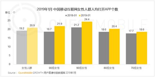 截至2019年1月,女性用戶人均打開APP個(gè)數(shù)達(dá)21個(gè),高于移動(dòng)互聯(lián)網(wǎng)的平均水平。根據(jù)此前相關(guān)數(shù)據(jù)報(bào)告,移動(dòng)互聯(lián)網(wǎng)人均APP打開個(gè)數(shù)為19個(gè)。