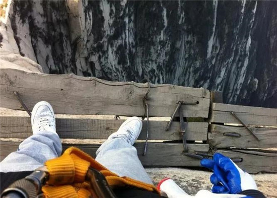 譯:不會(huì)有問(wèn)題吧?游客攀登數(shù)千英尺高的中國(guó)名山,到達(dá)700年前修建的木棧道上。