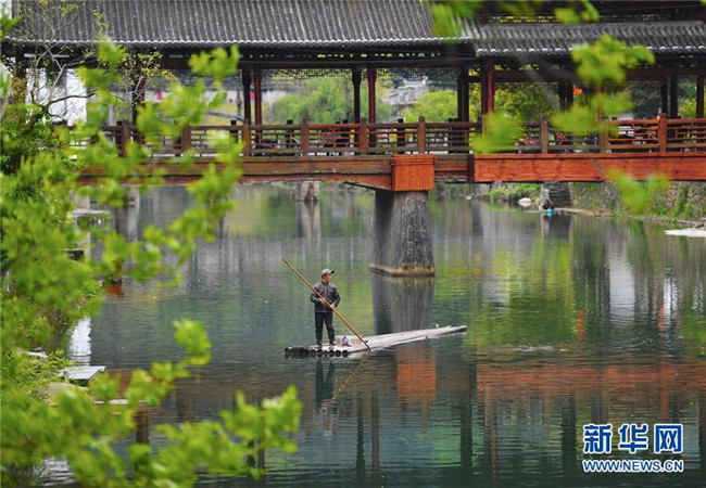 4月3日,瑤里古鎮(zhèn)的工作人員在清理河道。 時(shí)下,位于江西省景德鎮(zhèn)市浮梁縣的瑤里古鎮(zhèn)風(fēng)景如畫(huà),吸引不少游客。 新華社記者 胡晨歡 攝