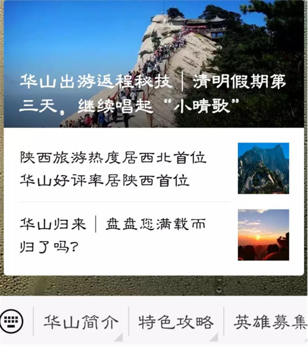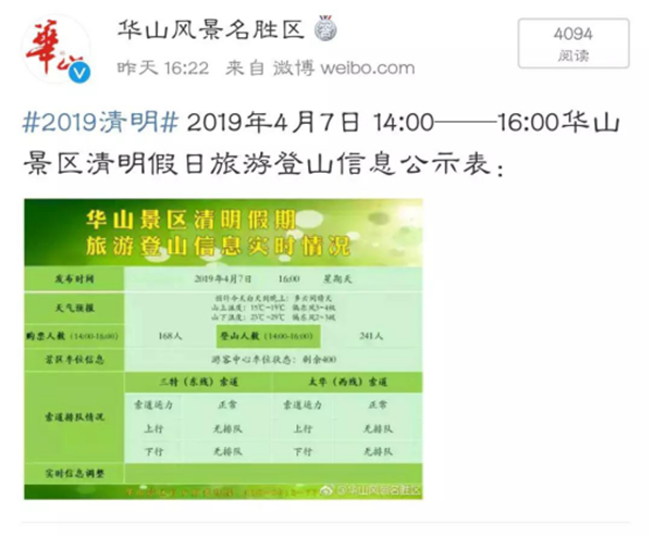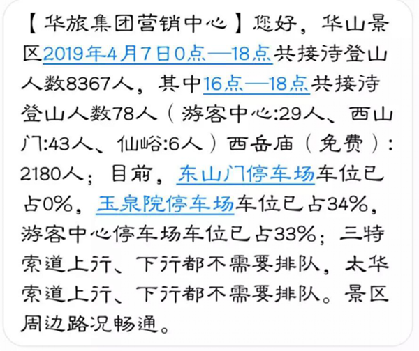 景區(qū)節(jié)日期間通過電子大屏、官方微博、微信、短信平臺向游客和各單位提供實時登山排隊人數(shù)、車位、天氣等信息。(小長假期間新浪微博共計發(fā)送微博48條,網(wǎng)友留言及回復(fù)361條,閱讀量共計421446余次;微信公眾平臺共計發(fā)送18篇軟文報道,分享及轉(zhuǎn)發(fā)量共計1098次,閱讀量共計10272次;短信平臺共計發(fā)送2394條短信,及時匯報各項旅游信息)。