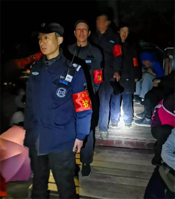 不論白天和黑夜,景區(qū)工作人員都依舊堅守崗位。他們?yōu)榕抨犛慰退腿崴?、幫扶老幼傷員、尋找并安撫失散游客、維護(hù)游覽秩序,確保游人安全舒心的游覽華山。