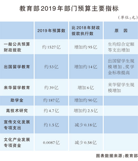 關于資金來源,教育部2019年部門預算顯示,2019年一般公共預算財政撥款約為1527億元,比上年執(zhí)行數(shù)增加約95億元。其主要原因為生均綜合定額、出國留學經(jīng)費以及學生資助工作專項等支出增加。