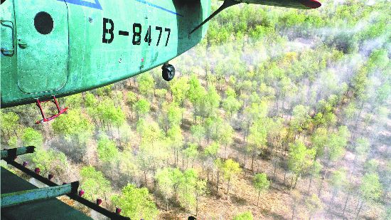 4月14日,一架農(nóng)用飛機(jī)在第一師10團(tuán)防風(fēng)林帶上空噴灑殺蟲劑。自4月上旬以來,兵團(tuán)對(duì)葉爾羌河、塔里木河流域的第一師、第二師和第三師的35萬畝野生胡楊林和人工林實(shí)施飛防,有效控制食葉害蟲對(duì)野生胡楊林和人工林的危害。王志清 攝
