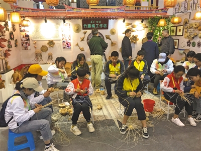 學(xué)生藝術(shù)實踐工作坊,來自福建安溪的小學(xué)生展示竹藤編。記者 馮琪 攝