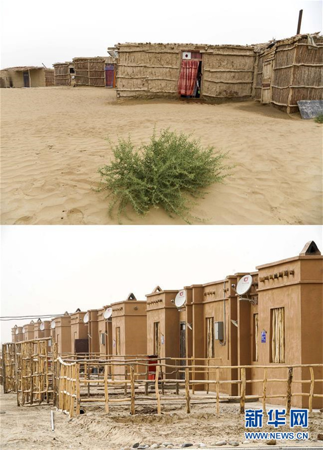 拼版照片:上圖為新疆于田縣達里雅布依鄉(xiāng)的民居(2018年9月7日攝);下圖為達里雅布依小鎮(zhèn)易地扶貧安置點的房屋(2019年3月20日攝)。新華社記者 胡虎虎 攝