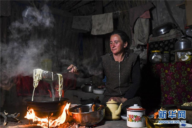 在地處塔克拉瑪干沙漠腹地的于田縣達里雅布依鄉(xiāng)5小隊,依明的妻子在夜間做拌面(3月16日攝)。新華社記者 胡虎虎 攝